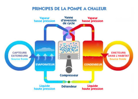 - Récupérer de l'énergie dans le milieu extérieur (sol/eau/air) grace à l'évaporateur,