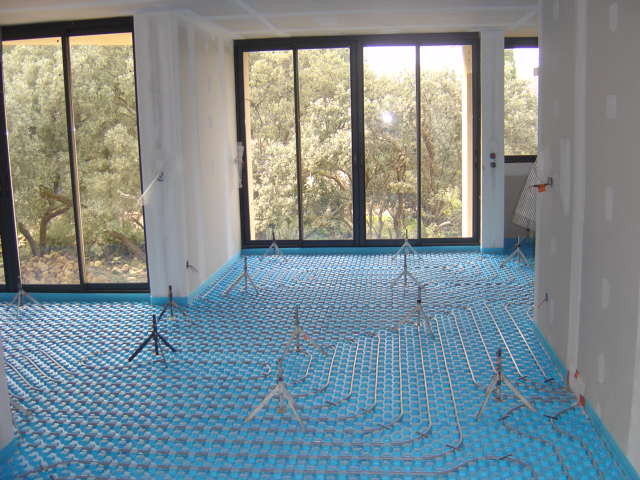 Invisible et agréable, il est particulierement adapté aux maisons individuelles neuves. Il permet de chauffer ou rafraichir le logement selon les saisons. Placé dans une chape pouvant recevoir différents revêtements de sols ( le carrelage est le revêtement le mieux adapté), un réseau de canalisations parcourt l'ensemble du logement dans lequel circule l'eau chauffée ou rafraichie par lapompe à chaleur, selon les besoins: